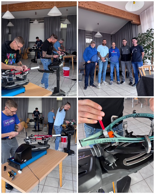 Aufbau: Theorie-Teil + Praktischer Teil (Training an den Besaitungsmaschinen, Hybrid-Besaitung, ATW Besaitung, Hand Pre-Stretch, Griffvergrösserung + Basisgriffband-Montage, Ösenbandwechsel, Einführung Racket-Tuning). Bei diesem Workshop können die Prüfungen zum ERSA Professional Stringer (PS) oder die nächsthöhere Zertifizierungs-Stufe zum ERSA Master Professional Stringer 1 (MPS1) abgelegt werden.