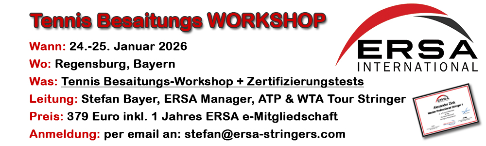 Der nächste Workshop findet am Wochenende 24.-25. Januar 206 in Regensburg, Bayern, statt . Preis für den Workshop inklusive 1 Jahr ERSA e-Mitgliedschaft + Racketpedia/Stringingpedia.com Zugang: 379 Euro (300 Euro Workshop + 79 Euro ERSA 1-Jahres e-Mitgliedschaft). Die Testgebühren für die Zertifizierung zum ERSA Professional Stringer oder ERSA Master Professional Stringer 1 betragen 119 Euro (sind separat zu bezahlen).