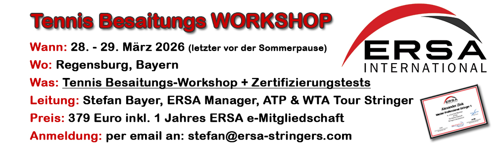 Der letzte ERSA Workshop vor der Sommerpause findet am Wochenende 28.-29. März 206 in Regensburg, Bayern, statt . Preis für den Workshop inklusive 1 Jahr ERSA e-Mitgliedschaft + Racketpedia/Stringingpedia.com Zugang: 379 Euro (300 Euro Workshop + 79 Euro ERSA 1-Jahres e-Mitgliedschaft). Die Testgebühren für die Zertifizierung zum ERSA Professional Stringer oder ERSA Master Professional Stringer 1 betragen 119 Euro (sind separat zu bezahlen).